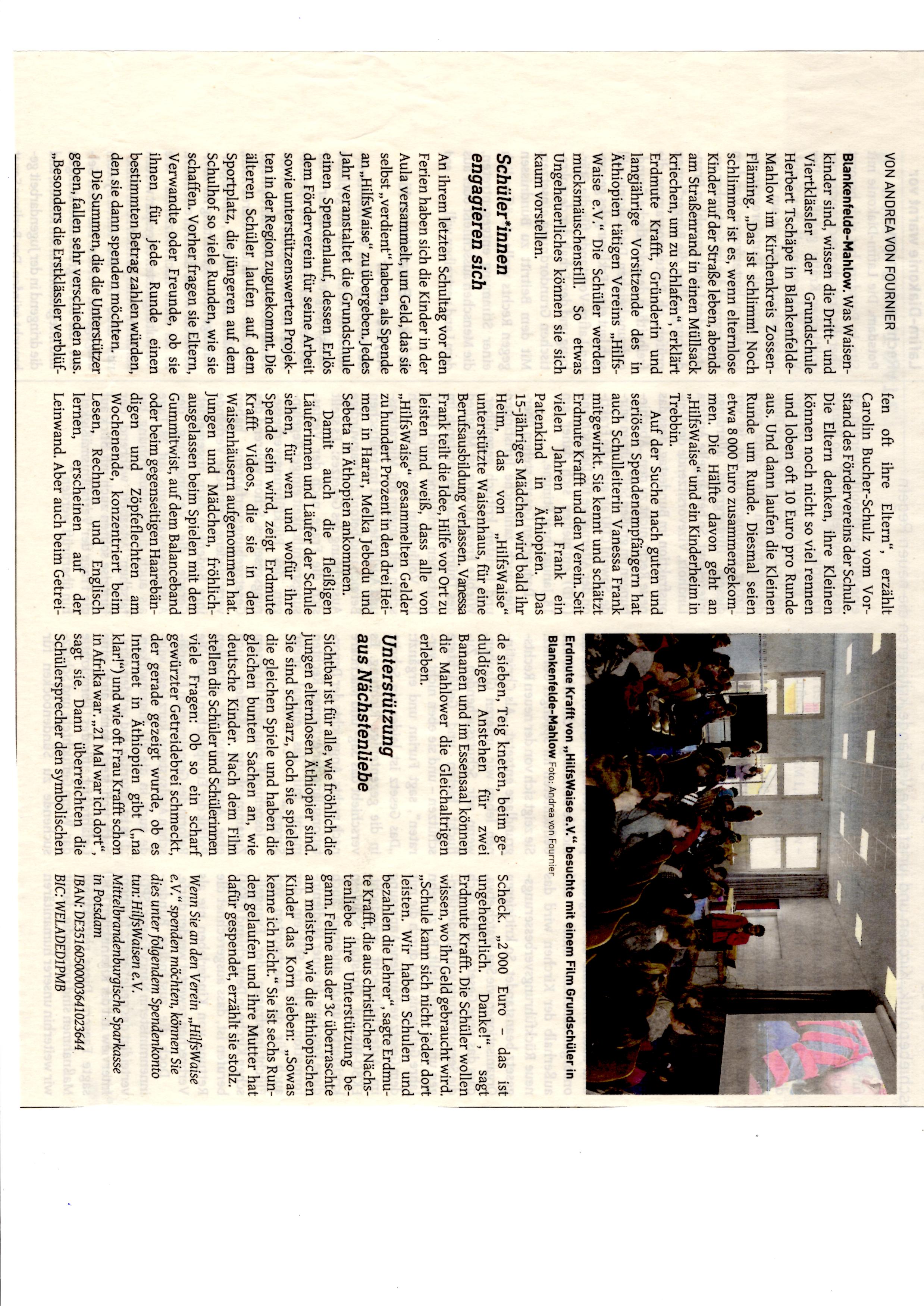 Diese beiden Artikel aus der Zossener Rundschau und aus dem Wochenspiegel berichten über das freiwillige Engagement der Schüler einer 6. Klasse für die Kinder in Äthiopien. Wir sind stolz auf Klasse 6b und sagen Dankeschön!