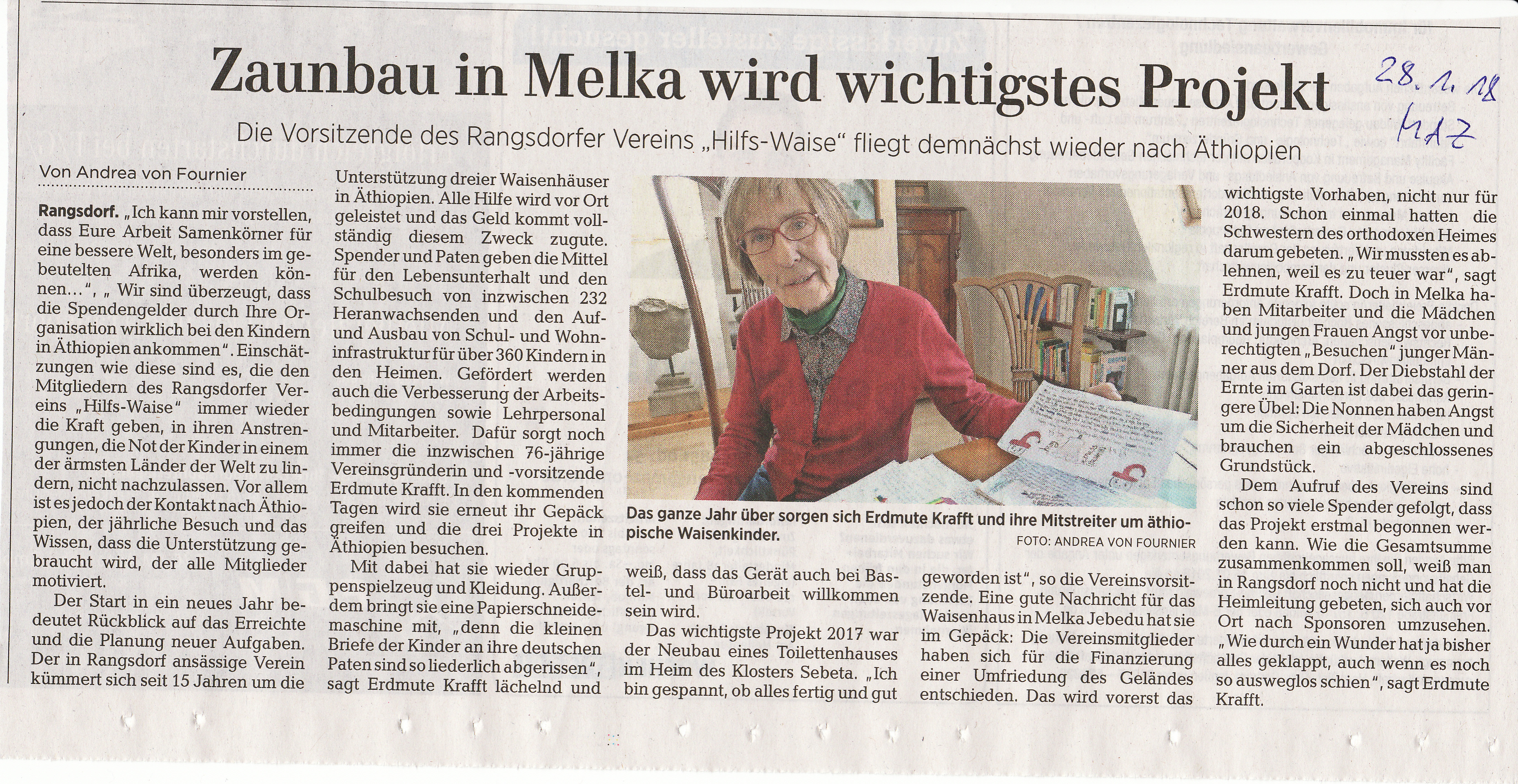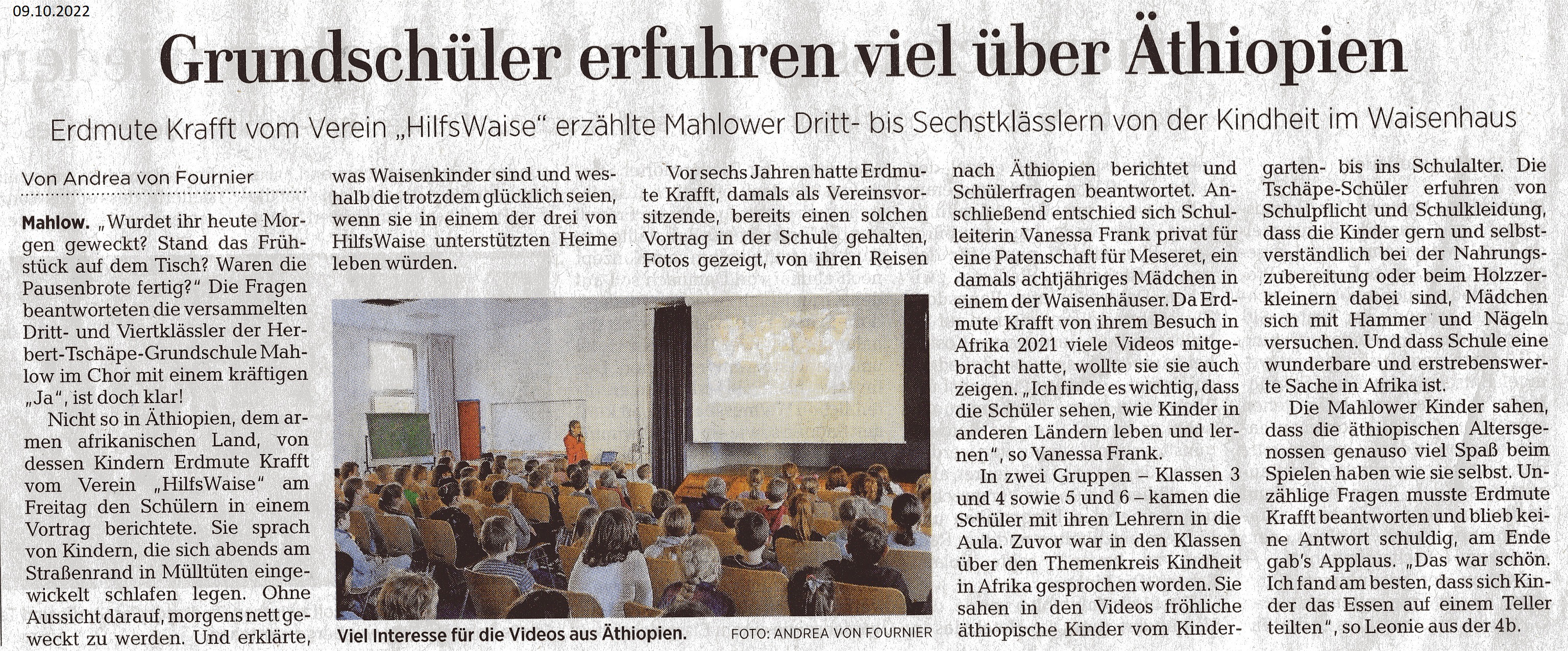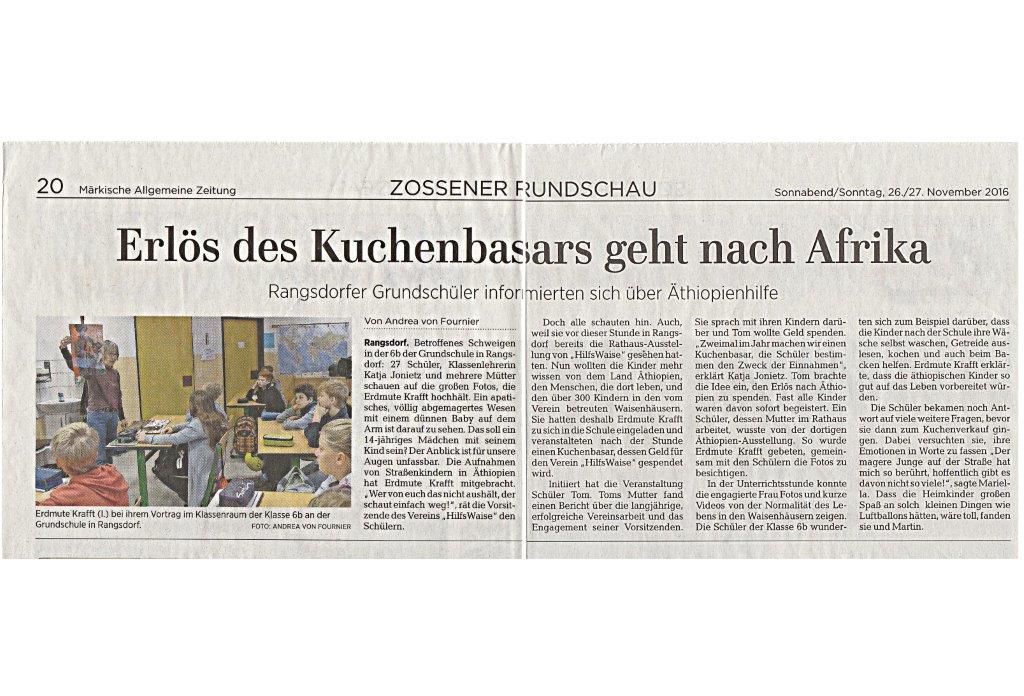 Dieser schöne Artikel aus der MAZ berichtet vom Vortrag des Vereins im Evangelischen Gemeindezentrum Rangsdorf, bei dem über die diesjährige Fahrt nach Äthiopien und die Arbeit von HilfsWaise e.V. gesprochen wurde.